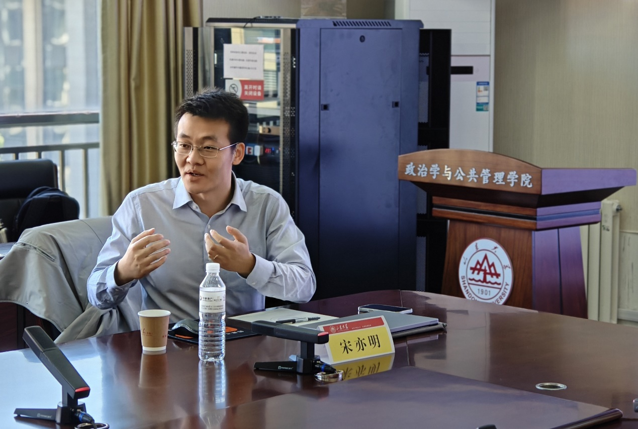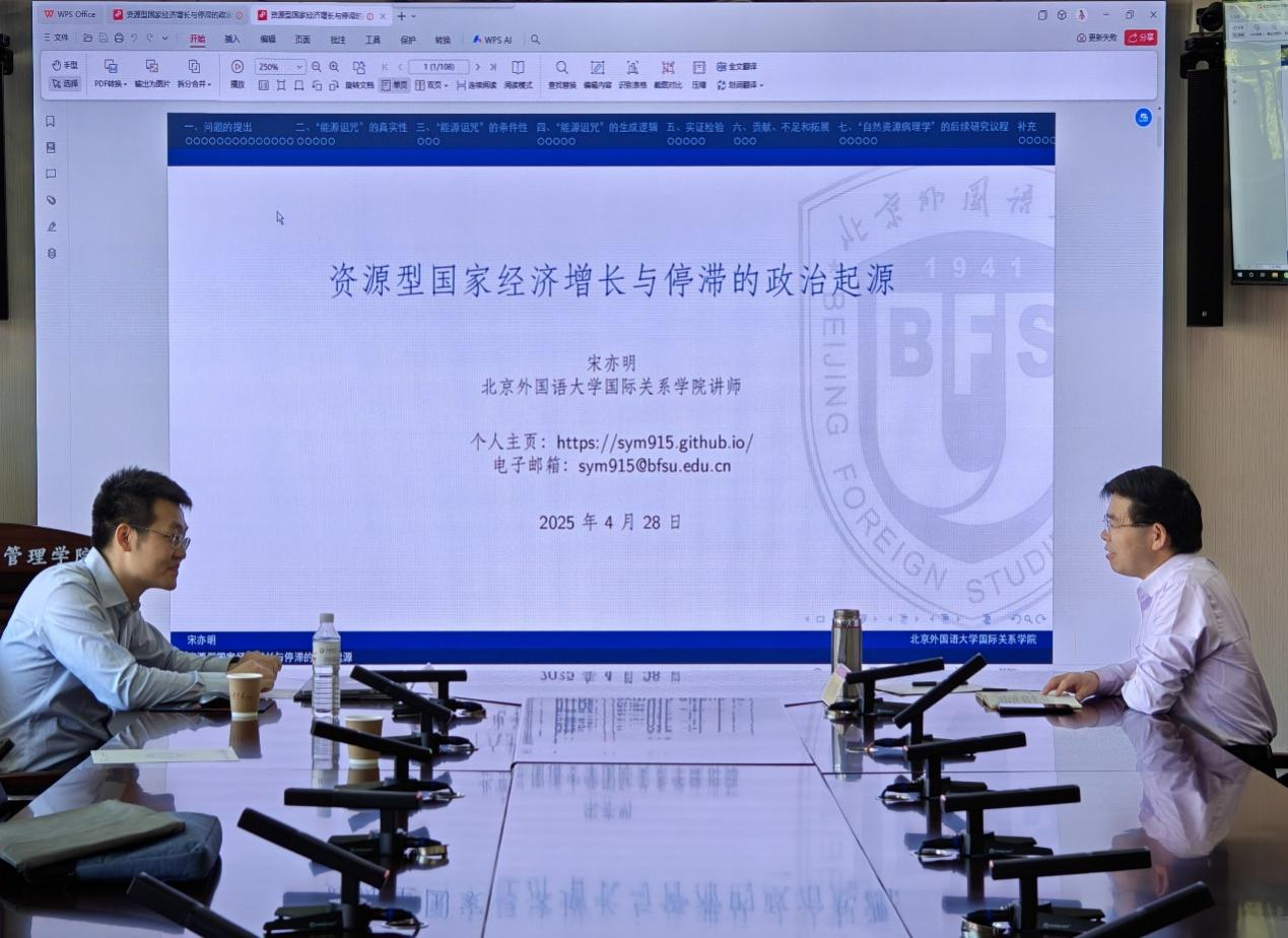 2025年4月28日,山东大学“全球治理与国际关系前沿讲坛”第七期在山东大学(青岛)华岗苑南楼举行。北京外国语大学国际关系学院外交学系主任宋亦明博士以“资源型国家经济增长与停滞的政治起源”为题作了精彩讲座。山东大学政治学与公共管理学院李慧明教授主持讲座,国际政治专业的部分老师和研究生参加了此次学术讲座。